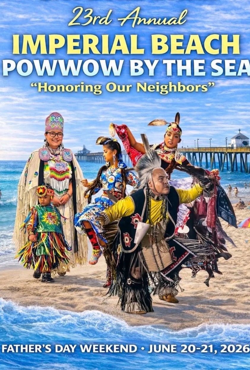 June Fathers Day and December Xmas and Powwow by the Sea, Imperial Beach, CA Join One World Bridge, Native Like Water and the Native Community of San Diego and beyond at our yearly powwow to experience celebration of dance, culture and the spirit of giving. One of the only powwows on the beach in Southern California, the drum and songs always call the dolphins near and attracts vendors and dancers from near and far. Located at the base of the Imperial Beach Pier Park.
