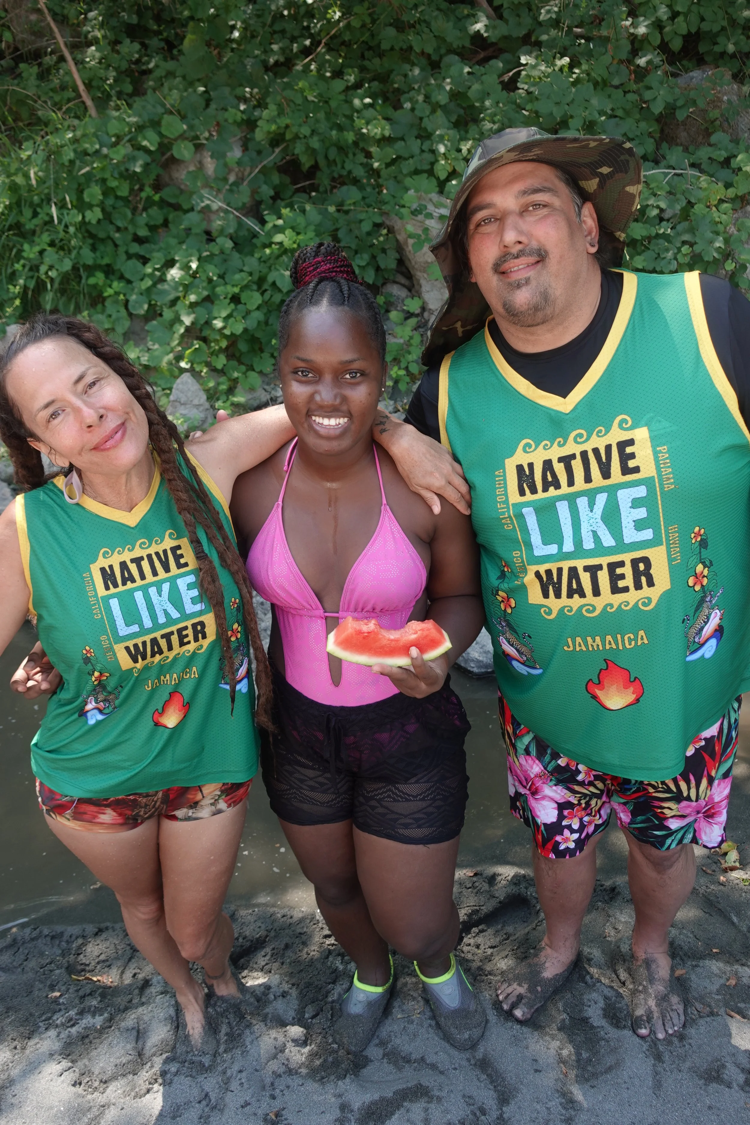 on the waters edge on jungle hike with Bob Marley Foundation Intern and NLW Exchange student, fine artist @kobi.kaee (middle)